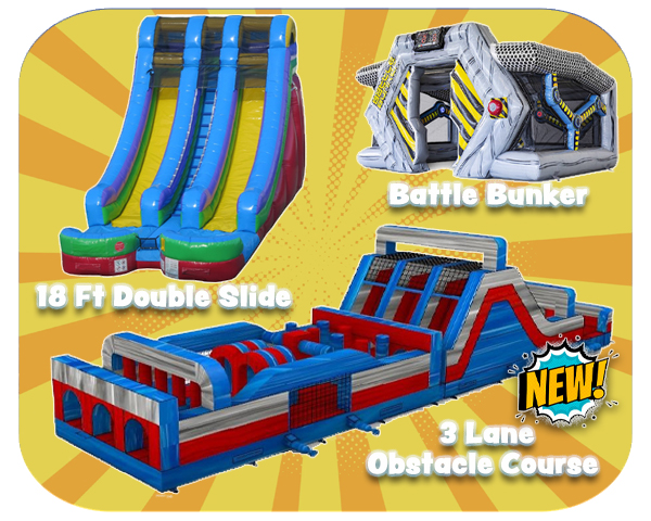 This package offers three fun inflatables that will provide hours of fun! Featured is our new 3 Lane Baja Obstacle Course, our 18 Foot Slide and our Battle Bunker. You get three activities for only $1375!