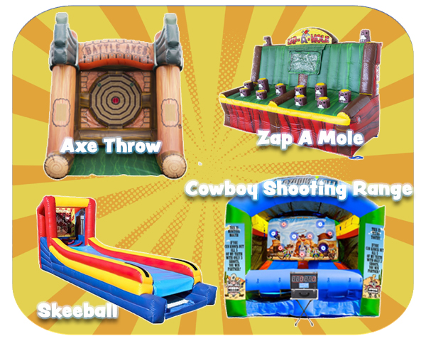 Our four game package will provide hours of fun! Players will compete on our velcro Axe Throw game. Who can hit the bullseye? Our Zap a Mole game uses the Intactive Play System which is an interactive game system. Players hit their team color as they light up. This same Interactive Play System is used in our Cowboy Shooting Range. Players shoot foam balls the size of a golf ball at interactive targets. Our Skee Ball is an infatable version of the popular arcade game.You get four activities for only $999!