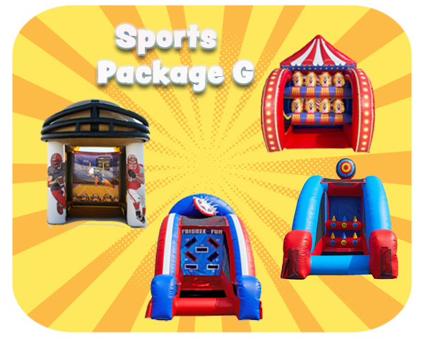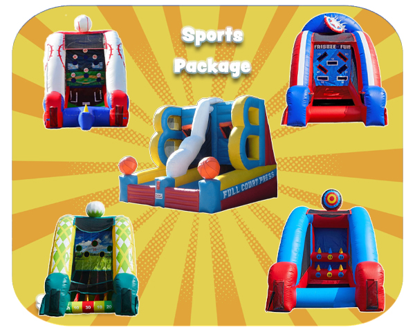 Our sports package includes five fun inflatable games. Basketball fans will love our Full Court Press. Two players compete by shooting baskets. When they make a basket the balls go to their competitors side. The first one to get all of their balls to the other side wins! Our Baseball, Golf, Frisbee and Knock it Off Challenges will provide hours of fun as players compete! You get three activities for only $844!