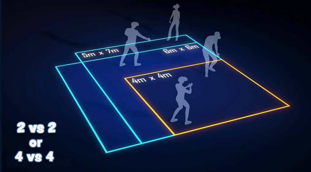 The playing area must be wide open with no poles, furiture or other items in the playing area. Basicallly there can be nothing in the playing area and the floor must be level and smooth. The play area must be at normal light level and unfortunately we can not play outdoors as the sun will damage the lenses of the VR headsets.